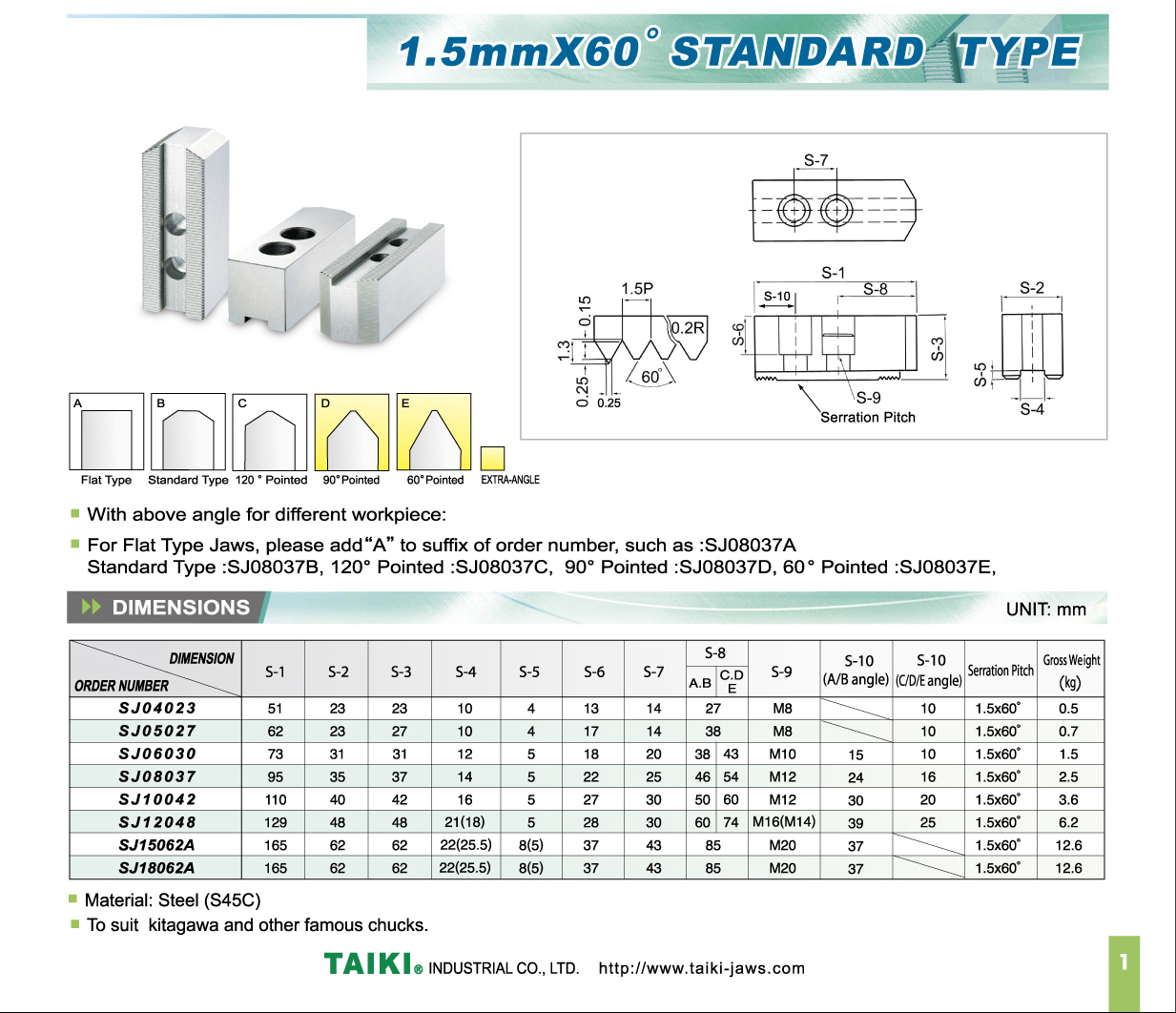 | Model | S-1 | S-2 | S-3 | S-4 | S-5 | S-6 | S-7 | S-8 | S-9 | S-10 | S-11 | Serration Pitch | Angle | Gross Weight (kg) |